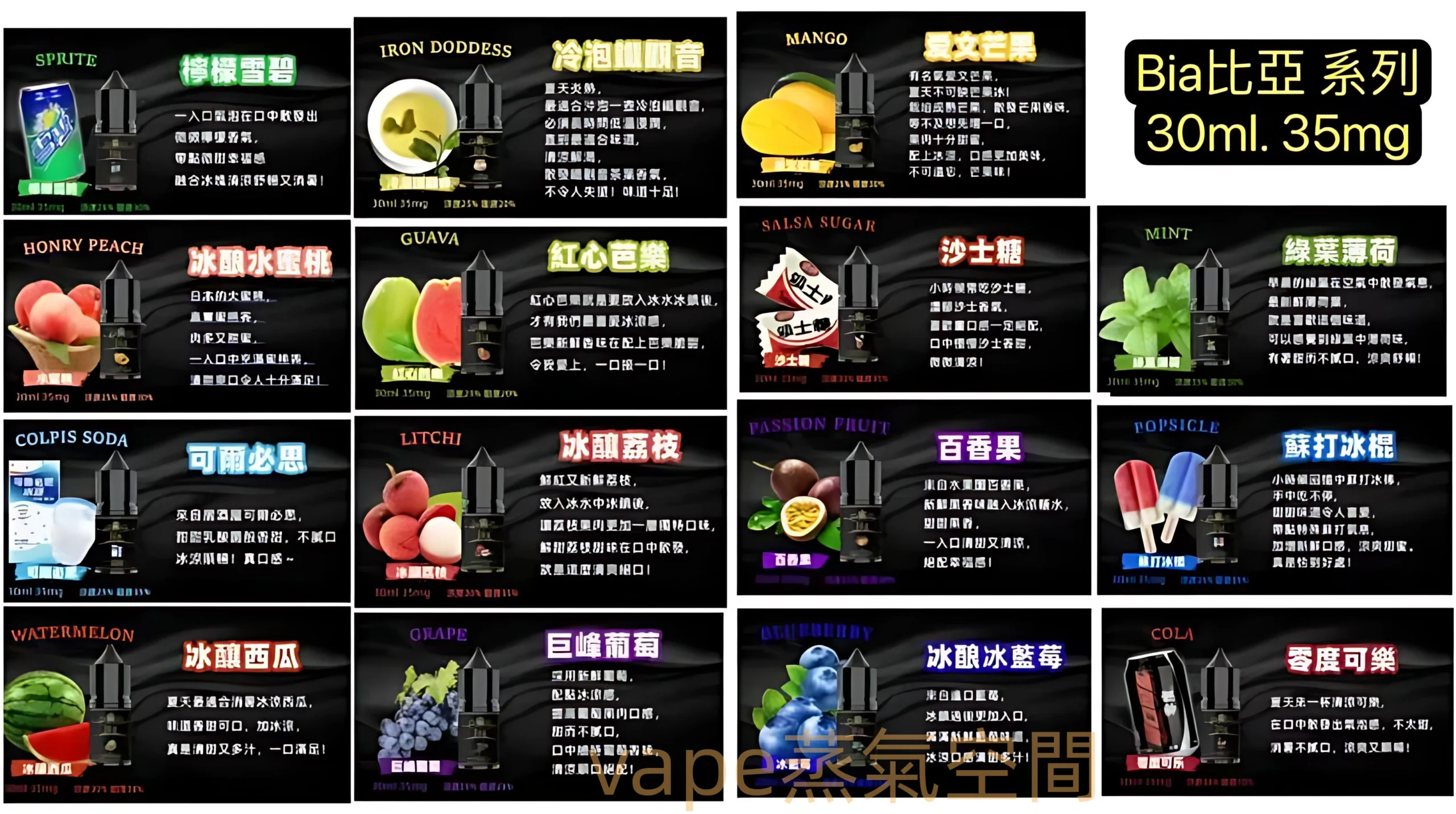 BIA(比亞)煙油專為追求極致滿足感的電子煙用戶設計。採用高純度 50MG尼古丁鹽 配方,帶來濃郁順滑的喉感與持久快感。搭配 多款熱門口味,滿足不同吸煙偏好。